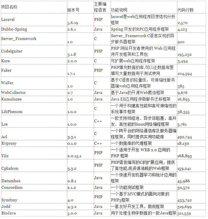 综合考虑用户数量、受关注程度以及更新频率等情况,选取了20款具有代表性的框架类软件。表1列出了本次被测的开源框架类软件项目的概况。本次检测的软件涵盖了C,C++,Java,PHP等编程语言。这些开源软件项目都是国际、国内知名的,拥有广泛用户的软件项目,其中不乏由知名软件公司开发的软件。由于这些软件大多具有巨大的用户群体,软件中的安全缺陷很可能会造成严重的后果。