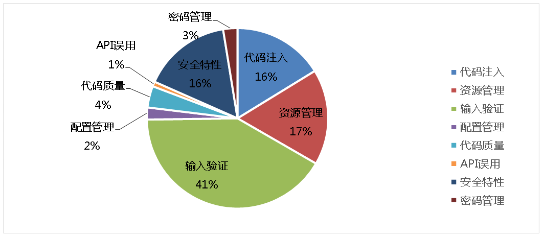 本部分对高危缺陷的分布情况进行分析说明。图3展示了被测项目中高危缺陷大类的分布情况。数据表明,大多数缺陷为“输入验证”类缺陷,该类缺陷主要是由于对用户输入未做充分验证导致的,易造成缓冲区溢出、路径遍历、跨站脚本及各类注入问题,一旦攻击者构造恶意输入,可能造成任意命令执行、任意文件读取等严重安全问题。