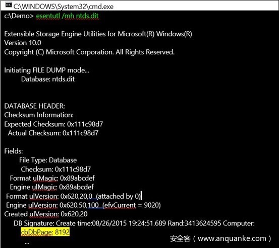 esentutl /mh 可以查看page大小,cbDbPage 就是page的大小, AD 和ADLDS 的page大小都是8K。其他的ESE数据库的大小不一样。