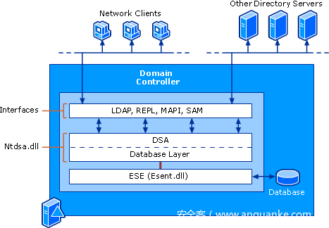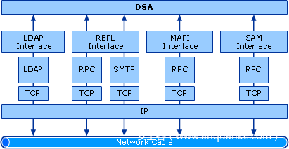 Directory System Agent (DSA) (Ntdsa.dll)DSA在每个域控制器上作为Ntdsa.dll运行,提供客户端和其他服务器通过其访问目录数据库的接口。 -
