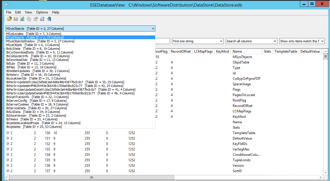 从图中可以看出来很多表,在所有ESE数据库都有一个名为MSysObjects和MSysObjectsShadow的表,它是MSysObjects的备份。