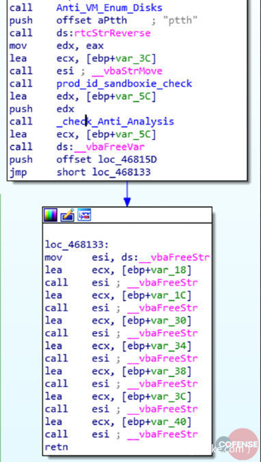 我们不仅看出命名上的差异(大部分合法程序以”frm“开头),还可推断出注入程序采用的随机命名的方式。除此之外,那些被注入了后门的函数,函数名无法解析,只是由解码器临时分配。