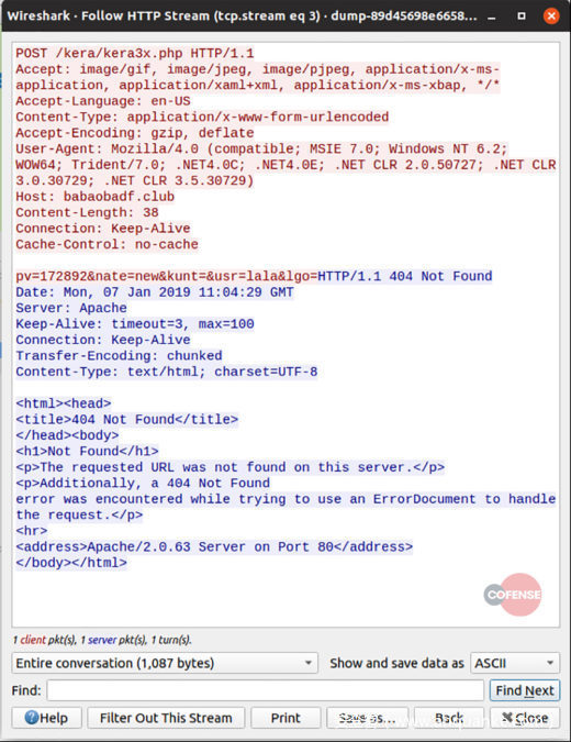 在继续进一步操作之前,Kutaki将与C2服务器进行通信,告知C2服务器又感染了一台新的主机。 图22是分析时观察到的相关流量