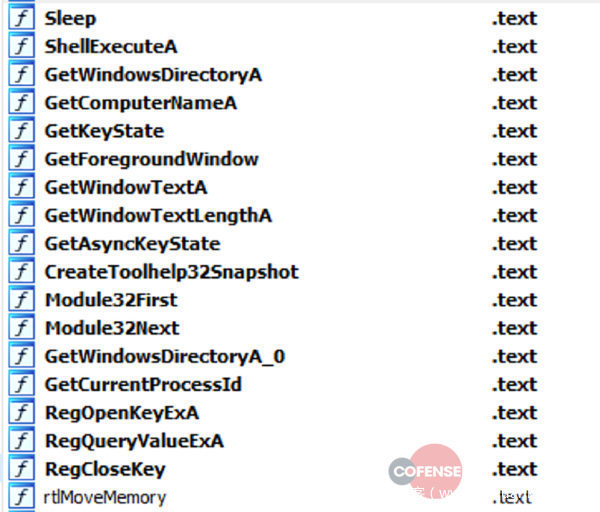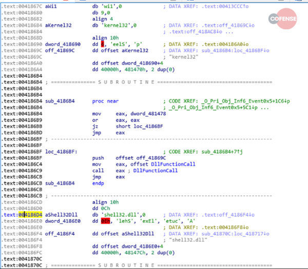 这些字符串是DllFunctionCall(Visual Basic应用中,一种可以特定DLL文件从检索函数地址的方法)中一个很小的结构体。如下所示: