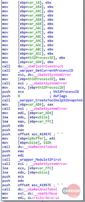 为了完善磁盘检测。Kutaki 将CreateToolhelp32Snapshot, Module32First 和 Module32Next结合,来确定沙盒及调试工具相关模块是否已经注入到内存地址中。这些API会对正在运行的进程进行快照(包括堆、模块等),找到第一个模块后,会对已经映射到进程的后续模块进行迭代。图15展示了Kutaki设置快照并对指向第一个模块的指针进行检索。