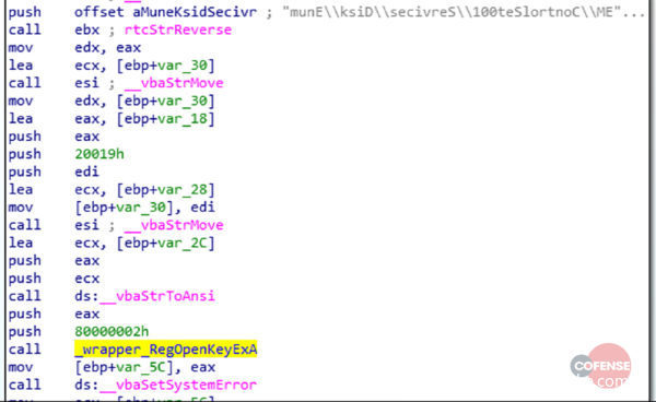 Kutaki使用了一些基本的检测和对比来验证自身是否运行在虚拟化环境中。首先它会读取注册表值HKLMSystemCurrentControlSetServicesDiskEnum,并将返回结果与“undesirable”字符串进行比较。图9为读取注册表代码。