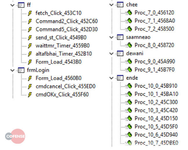 图4:”ff”和”frmLogin”是原生程序,而”chee”、”saamneao”、”dewani”以及”ende”是注入的后门
