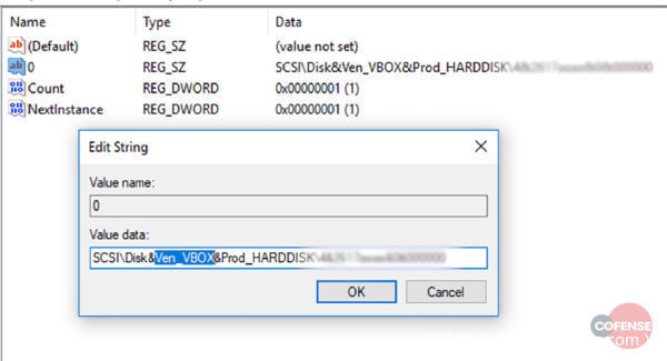 这个注册表表值中包含了当前计算机的磁盘信息。第一个磁盘对应的值为“0”,第二个磁盘对应的值为“1”,依此类推。在该分析VM的实例中,值0包含图10中观察到的数据。如图10,为分析反VM功能时,该计算机注册表值为0的实例。