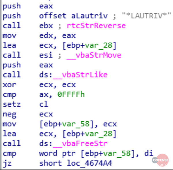 在隐藏可疑API调用时,使用了很多类似的字符串混淆。图6展示了对于Sleep和 ShellExecuteA字符串的混淆。