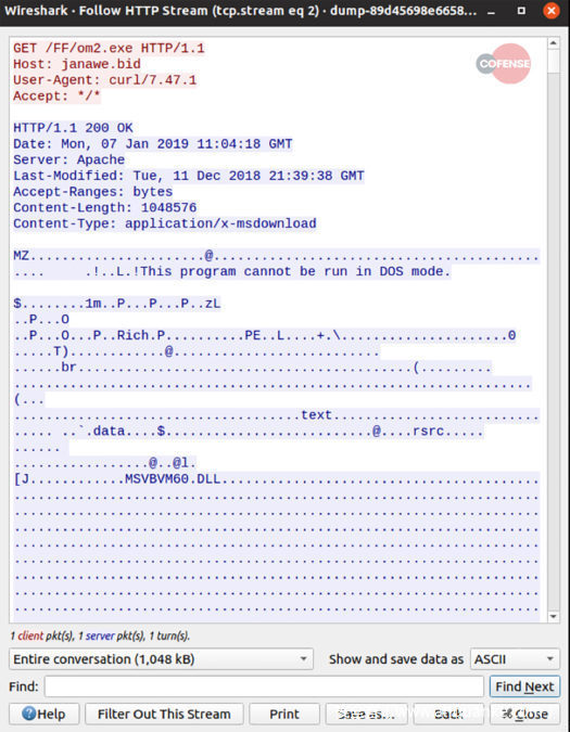 虽然Kutaki可以像之前那样直接和C2建立连接来下载payload,然而在这个阶段它却使用了cURL来连接C2服务器下载此时所需的payload。虽然其中缘由不得而知,但可以确定的是使用cURL是攻击者所设定好的,因为Kutaki直接请求下载其他payload时C2服务器会出现拒绝连接,而当User Agent为cURL时则可成功执行。图23记录了使用cURL与C2建立连接,获取第二阶段payload。