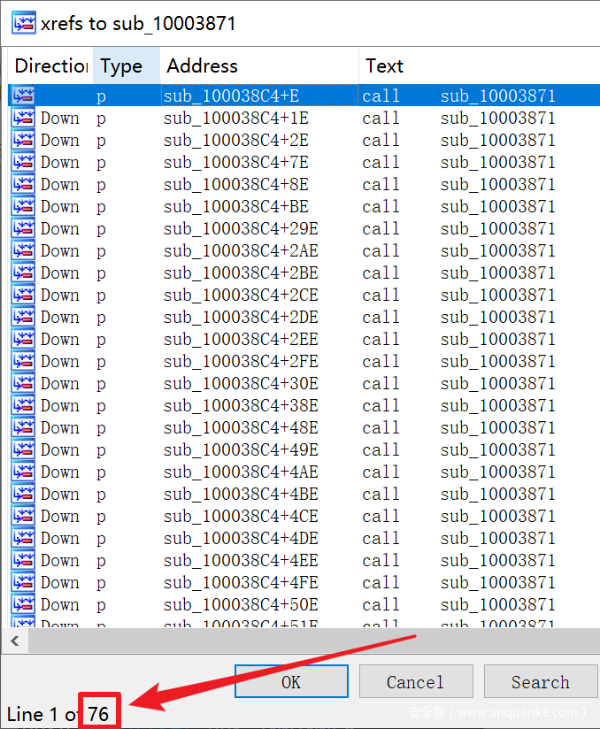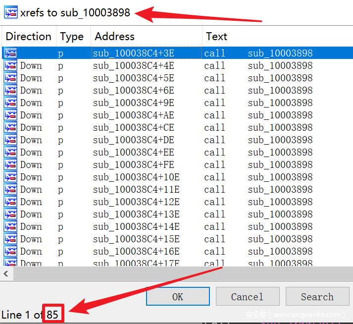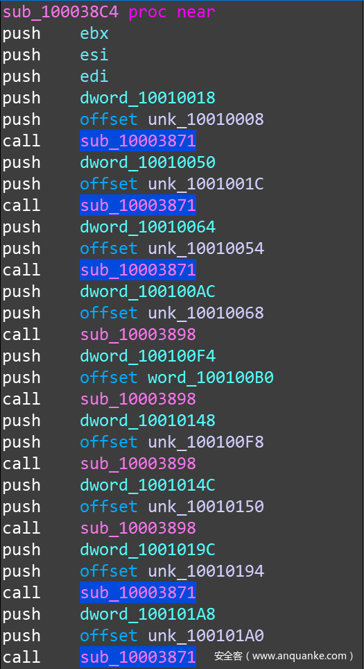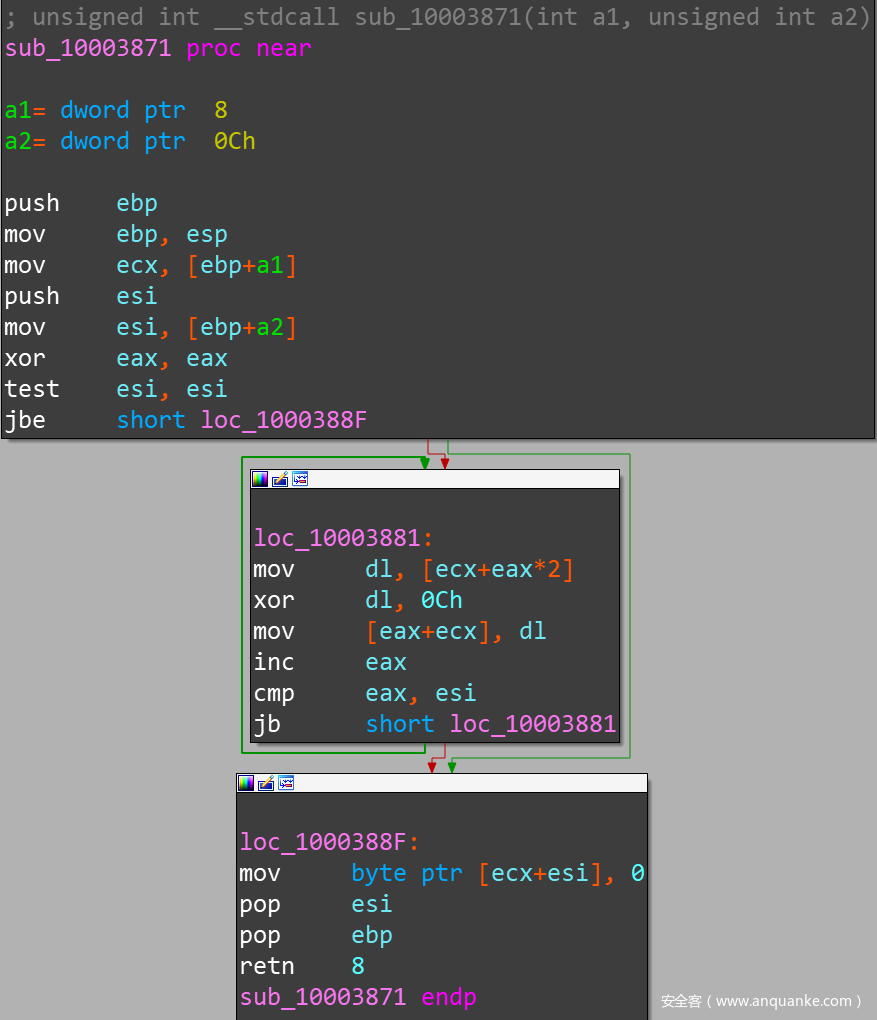 整个解密过程的函数是 sub_100038C4 ,里面会多次调用两个具体的解密函数:sub10003871 和 sub_10003898。前者解密 Ascii 字串,后者解密 Unicode 字串,都有两个参数:arg1—>要解密的字符串地址;arg2—>字符串长度。后面会把着两个函数分别命名为 DecryptAsciiStr 和 DecryptUnicodeStr 。这两个函数在 IDA 中看到的 xrefs 状况如下: