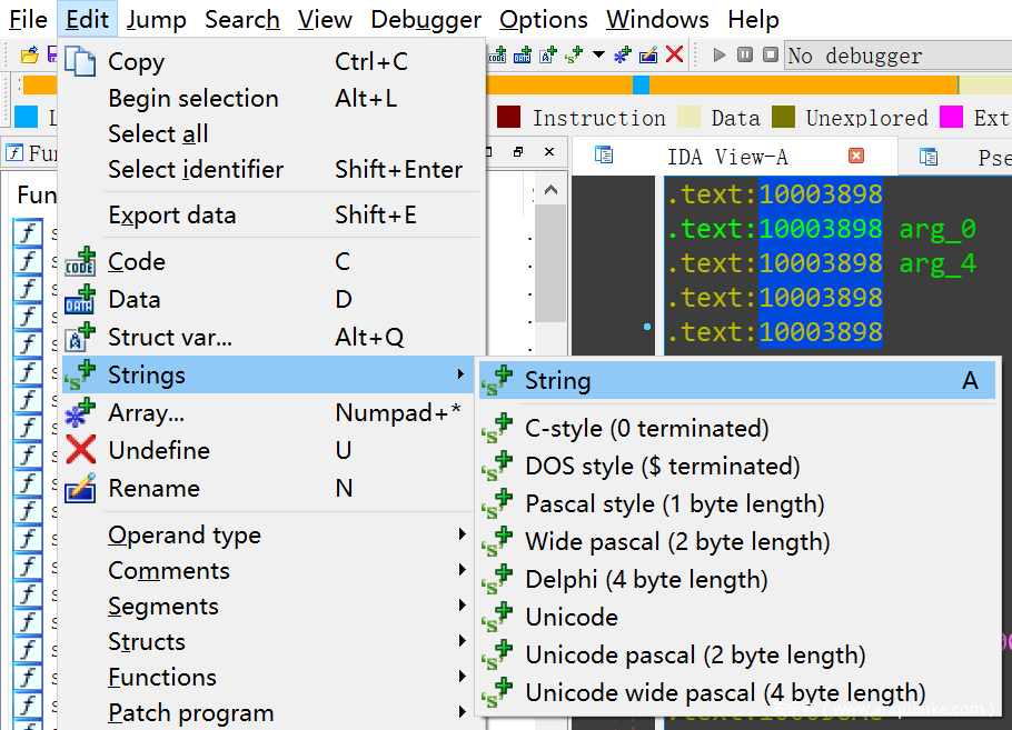 在 IDA 的 UI 界面中,可以选择生成的字符串的类型(如下图),快捷键只有一个 A,对应的 idc 函数是 idc.MakeStr(0。然而 ida.MakeStr() 函数默认是生成 Ascii 字串的,要想生成 Unicode 字串,就需要调用 idc.SetLongPrm() 函数设置一下字符串的类型。