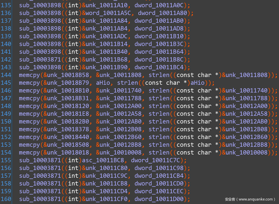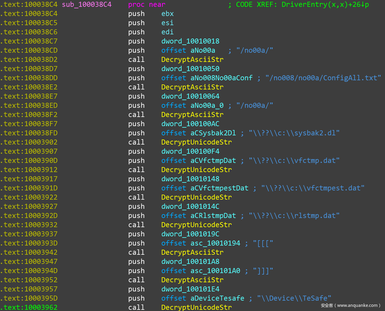 驱动程序中用到的 100+ 条字符串都做了自定义加密处理,在设置完各 IRP 派遣函数和卸载例程之后,第一步操作就是依次解密这些字符串。IDA 中打开样本,部分解密过程如下:
