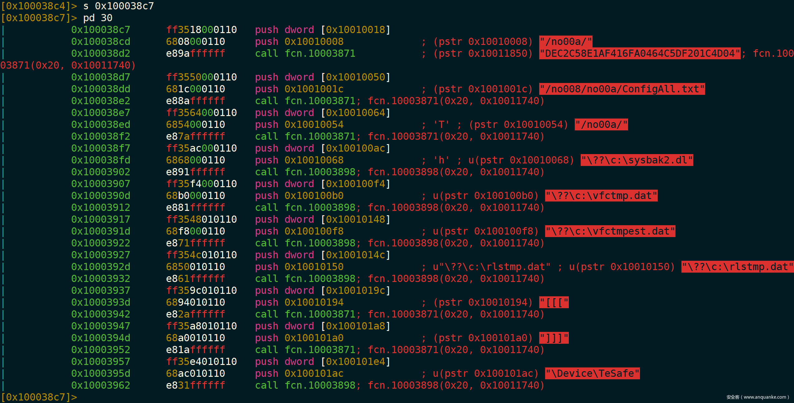 在 r2 上用这个东西来模拟指令解密这一批字符串,就不用像 IDA 中那样还要自己动手写 IDAPython 脚本了,只需要通过 r2 指令配置好几个相关参数即可。下面两张图是在 r2 中通过指令模拟批量解密这些字符串的前后对比: