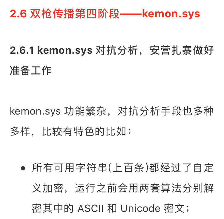 在 360Netlab 的旧文 《“双枪”木马的基础设施更新及相应传播方式的分析》 中,提到了 双枪 木马传播过程中的一个恶意驱动程序 kemon.sys ,其中有经过自定义加密的 Ascii 字符串和 Unicode 字符串 100+ 条: