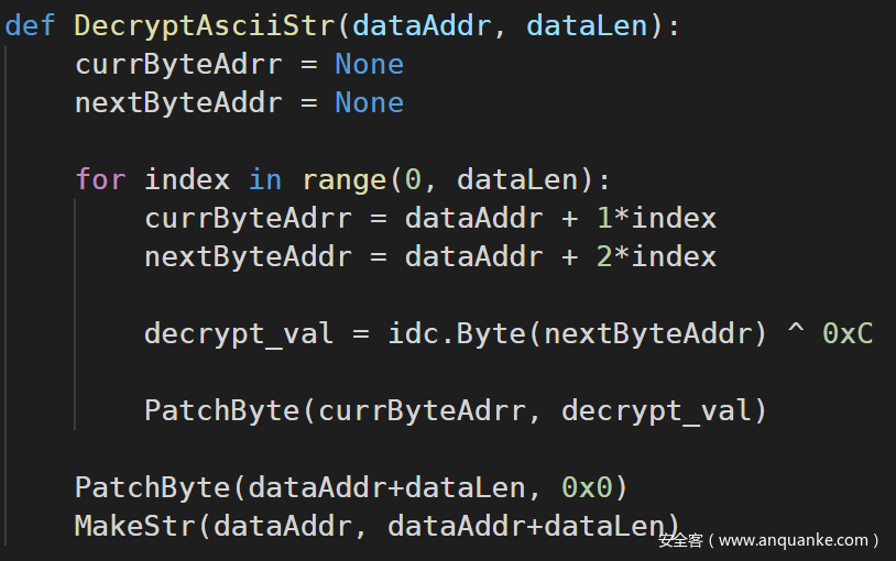 首先想到的思路是:就两个解密算法,而且不复杂,不妨直接写个 IDAPython 脚本,实现这两个解密算法。解密之后把明文字串直接写到 IDB 文件中,在 IDA 中呈现。两个解密算法的 Python 版本分别如下(附带对 IDB 的 Patch 操作):