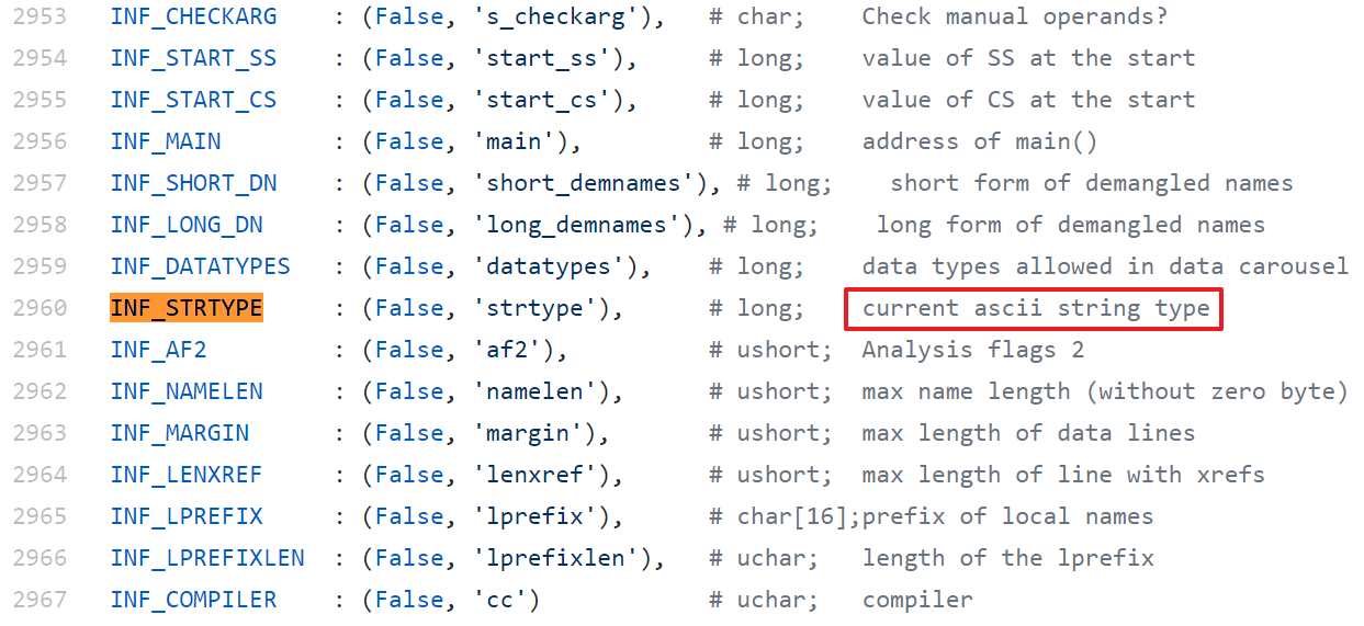 所以,要生成 Unicode 格式的字串,需要先用 idc.SetLongPrm() 函数设置一下字符串类型。其中 idc.INF_STRTYPE 即代表字符串类型的常量,在 idc 库中的定义如下: