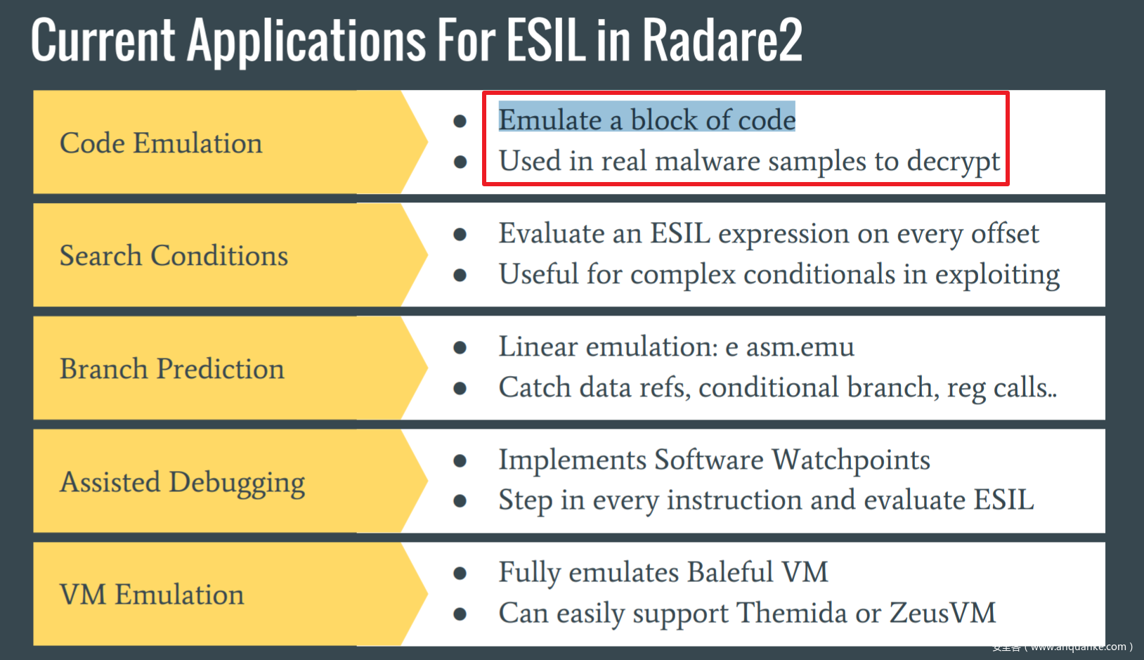 r2 上也有强大的指令模拟模块,名为 ESIL( Evaluable Strings Intermediate Language):