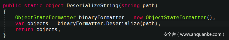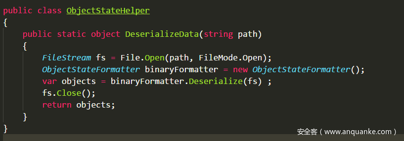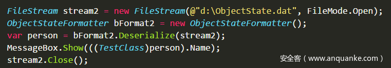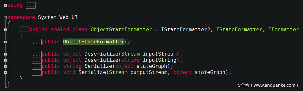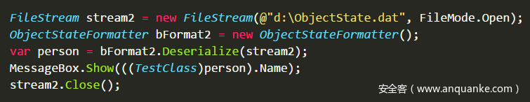 反序列过程是将二进制数据转换为对象,通过创建一个新对象的方式调用Deserialize方法实现的 ,查看ObjectStateFormatter格式化器定义一样实现了IFormatter接口