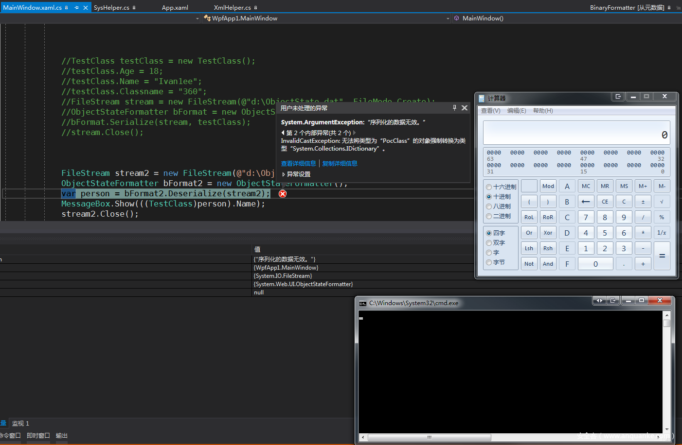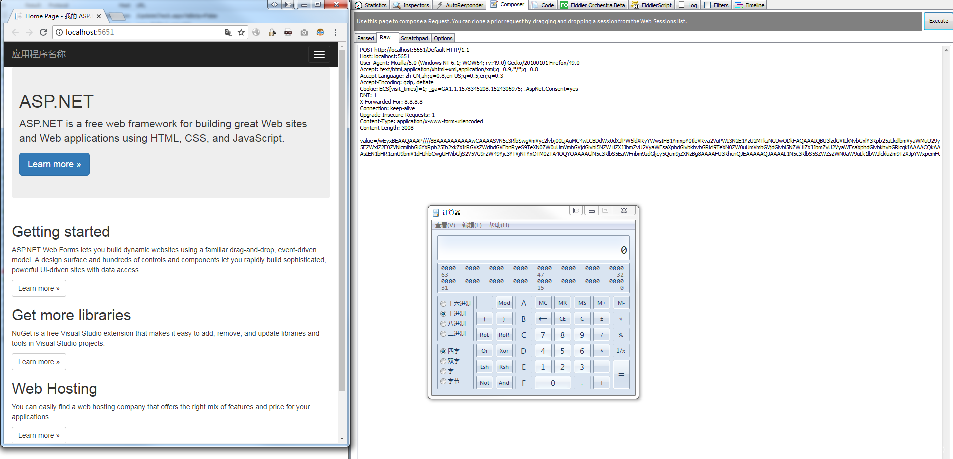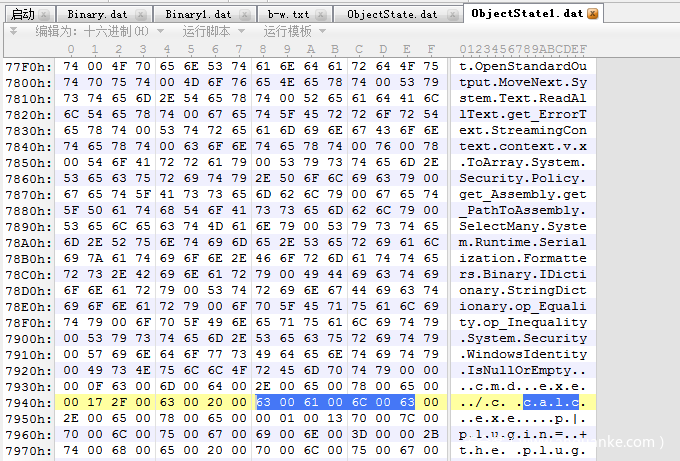 由于上一篇中已经介绍了漏洞的原理,所以本篇就不再冗余的叙述,没有看的朋友请参考《.NET高级代码审计(第八课) SoapFormatter反序列化漏洞》,不同之处是用了ObjectStateFormatter类序列化数据,同样也是通过重写ISerializationSurrogate 调用自定义代码,笔者这里依旧用计算器做演示,生成的二进制文件打开后如下图