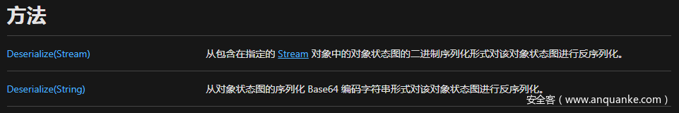 从代码审计的角度找到漏洞的EntryPoint,Deserialize有两个重载分别可反序列化Stream和字符串数据,其中字符串可以是原始的Raw也可以是文档中说的Base64字符串,两者在实际的反序列化都可以成功。