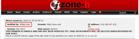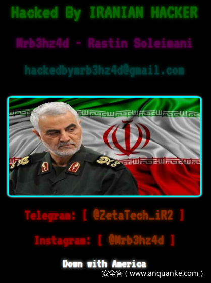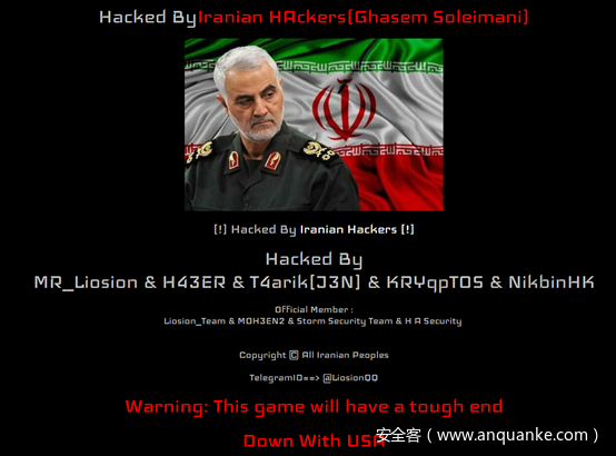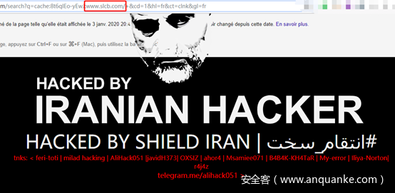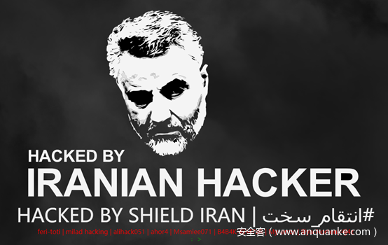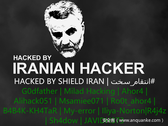 除了上面这种专门针对美国政府网站进行攻击的行为之外,还有一个名为SHIELD IRAN的黑客团伙开始随机攻击任意网站,并挂上具有少将头像的黑页,我们在得知塞拉利昂商业银行(slcb.com)被攻击后,通过谷歌缓存发现