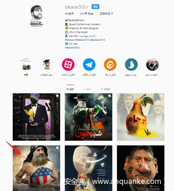 而这张图片的制作者为takavar313.ir,同样为伊朗反美斗士,目前未知两者之间是否存在关系。