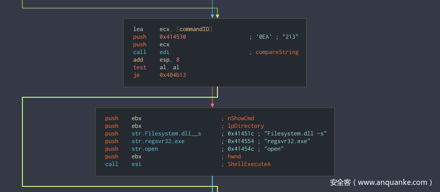 ShellExecuteA(0, "open", "regsvr32.exe", "Filesystem.dll -s", 0, 0);
