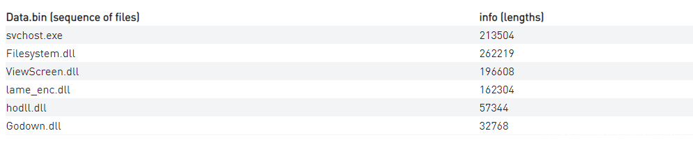 Distribute开始运行后,首先会读取释放的其他两个文件info和Data.bin。其中Data.bin是一个二进制文件,该文件中按顺序串联了多个PE。而info是一个非常小的文件,它包含了一个简单的结构,用于辅助读取Data.bin文件。Distribute将按照info中的文件长度顺序,将Data.bin中的PE文件以二进制流的形式进行读取。