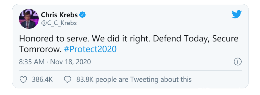无论是在媒体预测拜登将赢得2020年美国总统大选之前还是之后,特朗普一直声称选举期间,欺诈和安全问题猖獗。然而,特朗普一手扶持上来的克雷布斯却一再和他唱起反调,表示今年的选举是美国大选历史上最安全的一届。克雷布斯不仅在言语上为大选的准确性背书,还参与创建了CISA辟谣网站,以消除选举相关的阴谋论和错误信息。