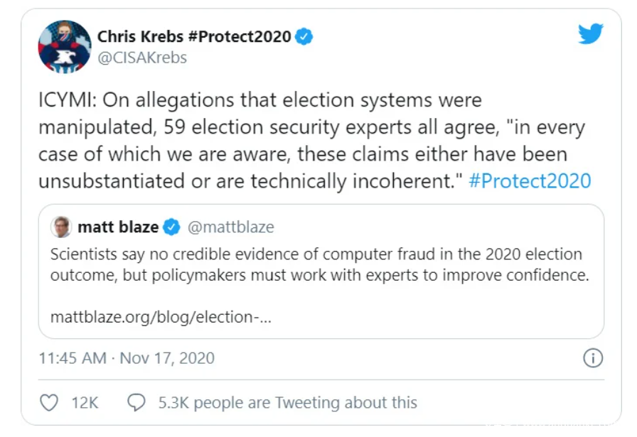 前两天,克雷布斯发布推文,再次申明:“安全专家一致认为,关于选举系统被人为操纵的说法缺乏事实根据,从技术层面来看也行不通。”