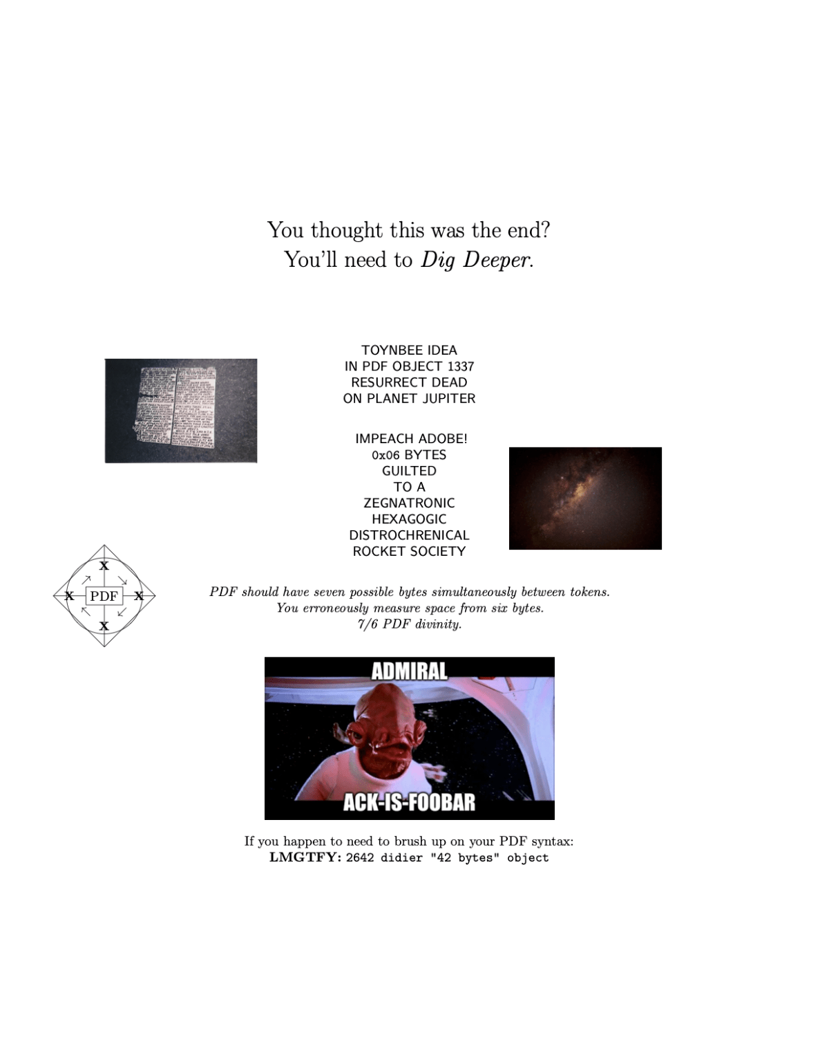 修复该文件对于解决挑战是否绝对必要?并非如此,实际上我们可以使用十六进制编辑器在0x1337号PDF对象中找到旗标: