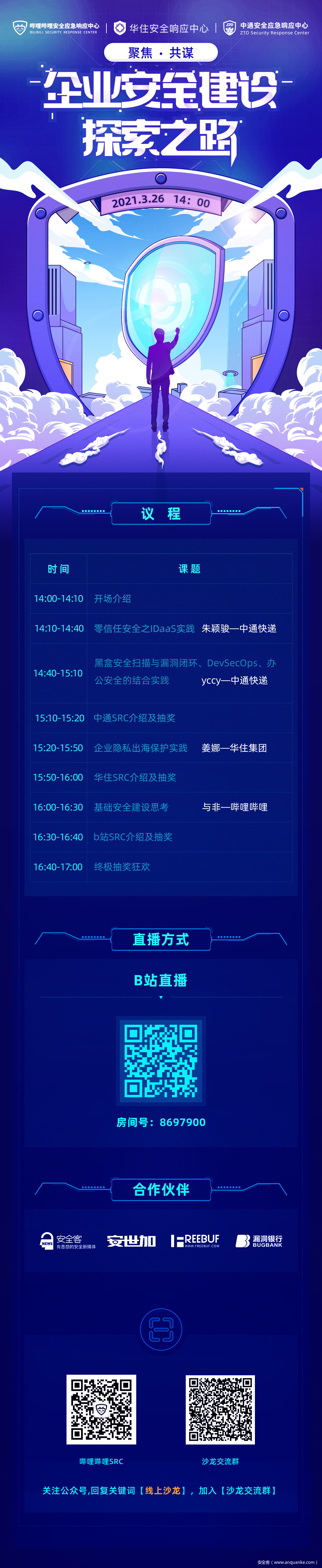 3月26日下午14:00哔哩哔哩安全应急响应中心、中通安全应急响应中心、华住安全响应中心将围绕“安全管理运营、安全隐私保护、零信任安全建设”等话题共同探索企业安全建设之路。