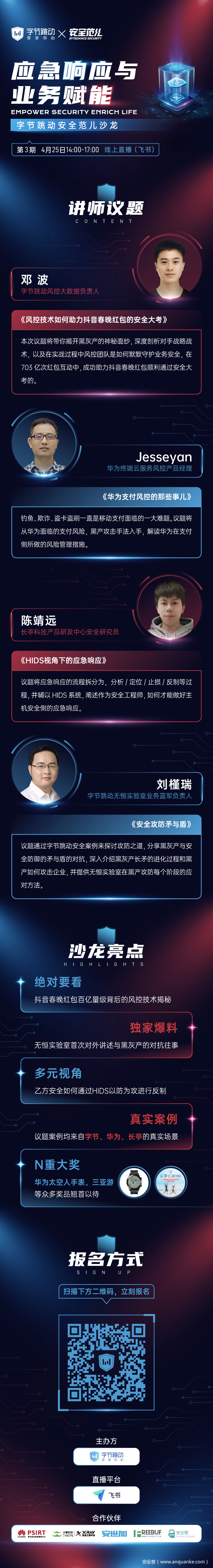 字节跳动应急响应与业务赋能沙龙报名开启!4月25日,字节跳动安全范儿沙龙第三期【应急响应与业务赋能】,让我们一起相约线上,聊聊应急响应与业务赋能的那些事儿!