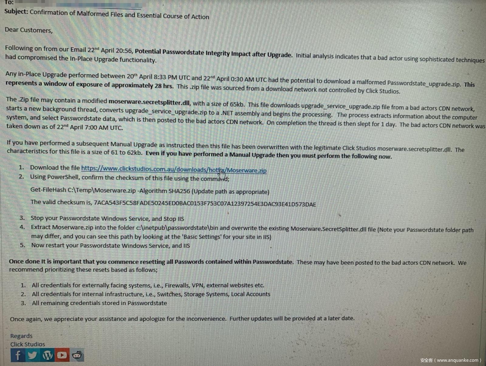 这款企业密码管理器应用程序名为Passwordstate,是澳大利亚软件公司Click Studios所开发的一款企业密码管理器。事发后,软件公司 Click Studios 已向 2.9 万名客户发送了告知电子邮件。