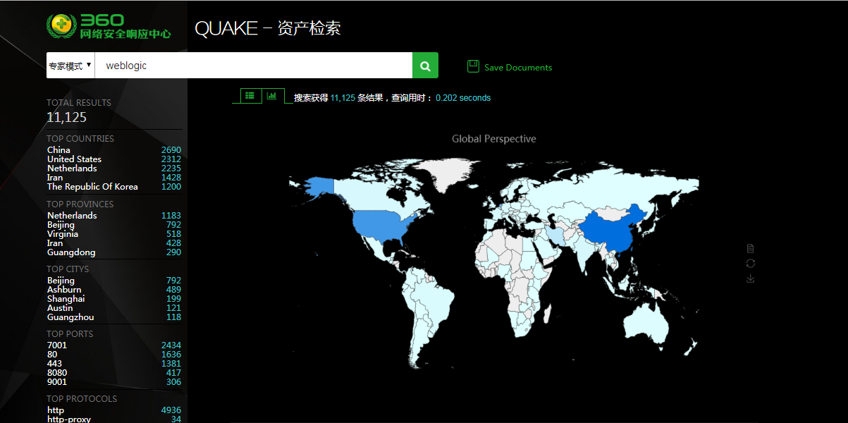通过QUAKE资产系统检索,全球范围内暴露在互联网上的weblogic服务多达11125台,中国区有2690台。