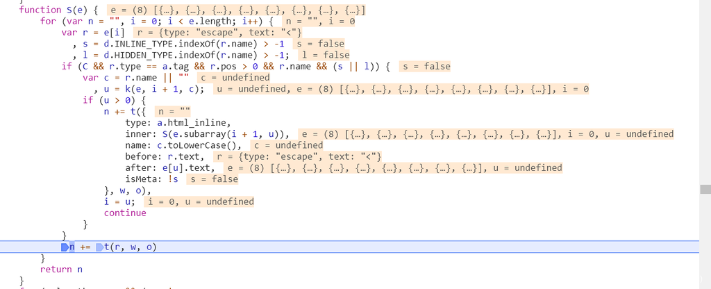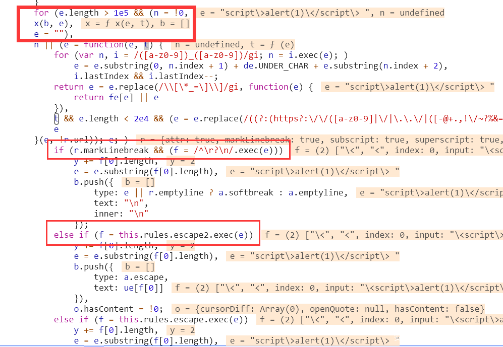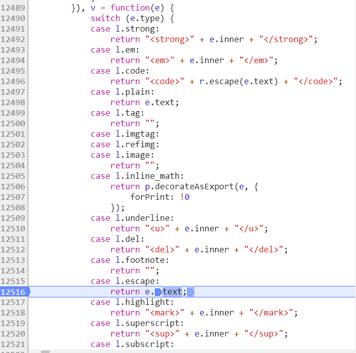 可以看到在经过i.output 这个方法之后,原本转义的字符完成了逃逸,并且作为HTML输出在了大纲栏和类名为.md-toc-inner 的标签之中(因此在渲染[TOC]的时候也会有同样的问题)。那么我们来跟入i.output 看一下为什么转义后的字符会逃逸: