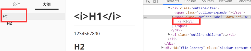 我们看到,左侧的大纲栏似乎并没有原样直接输出标题中的内容,而是除去了script标签。