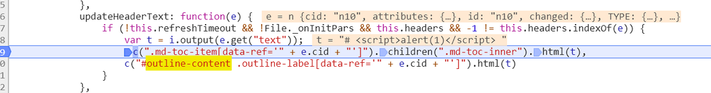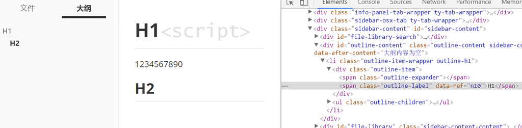 我们要寻找的是默认情况下,用户打开文档之后无需任何操作就能看到的输出位置,这样的位置上的 XSS 才是有意义的。那么除了实时预览界面就只剩下了左侧的大纲栏: