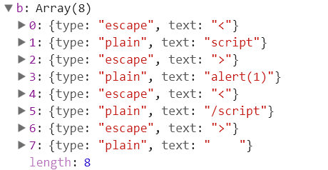 而当判断了输入的对象的中的type 为 escape 时则会直接返回对象的text 属性,导致了转义字符的逃逸。就这样,最终i.output 方法的返回值,也就是n 的值为: