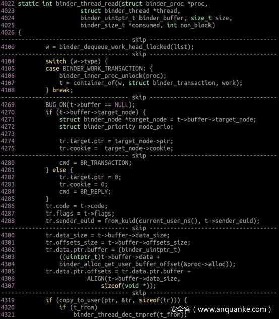 与此同时,用户端进程在循环调用“IPCThreadState::talkWithDriver()”等待server进程的响应。当有消息到达时,内核会通过调用图7中4100,4107行所示函数,将server进程发送过来的“struct binder_transaction”类型的对象取出,并保存在变量”t”中,其中“t->buffer”是被我们控制的恶意对象,而”target_node”是”struct binder_buffer”结构体的一个成员变量,若将其设置为非空值,将会被当成”struct binder_node”类型的指针,并从该指针加0x58、0x5c位置取值赋值给”tr.target.ptr”及”tr.cookie”。此后内核再调用4319行所示的”copy_to_user()”将数据传递给用户进程。通过这一机制我们便可以实现任意地址读。