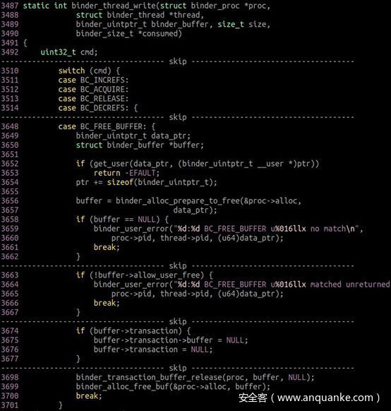 调用合适的堆喷函数去占位该”t->buffer”对象,堆喷成功后,图3中3178行所示的”t->buffer->data”可由攻击者完全控制,而”tr->data.ptr.buffer”是server进程发给用户进程的reply数据,可由攻击者间接控制。当“copy_from_user()”函数被执行时,便触发了任意地址写问题。
