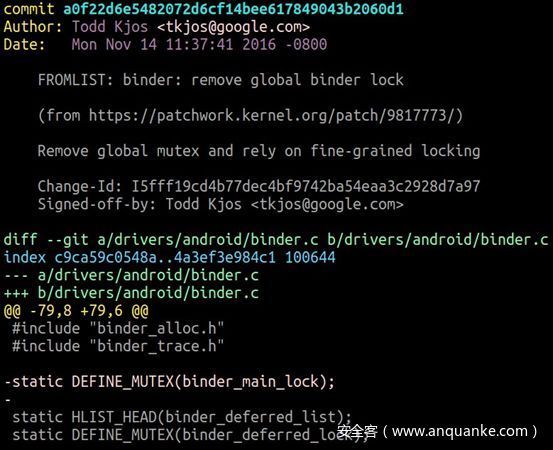 而此问题后续被优化,从”drivers/android/binder.c”的commit日志可以看到,2016年11月14日的一个补丁将这个全局互斥锁去掉,并优化为更加细粒度的互斥锁来保护,见图2。完整的补丁可参见链接[2]。