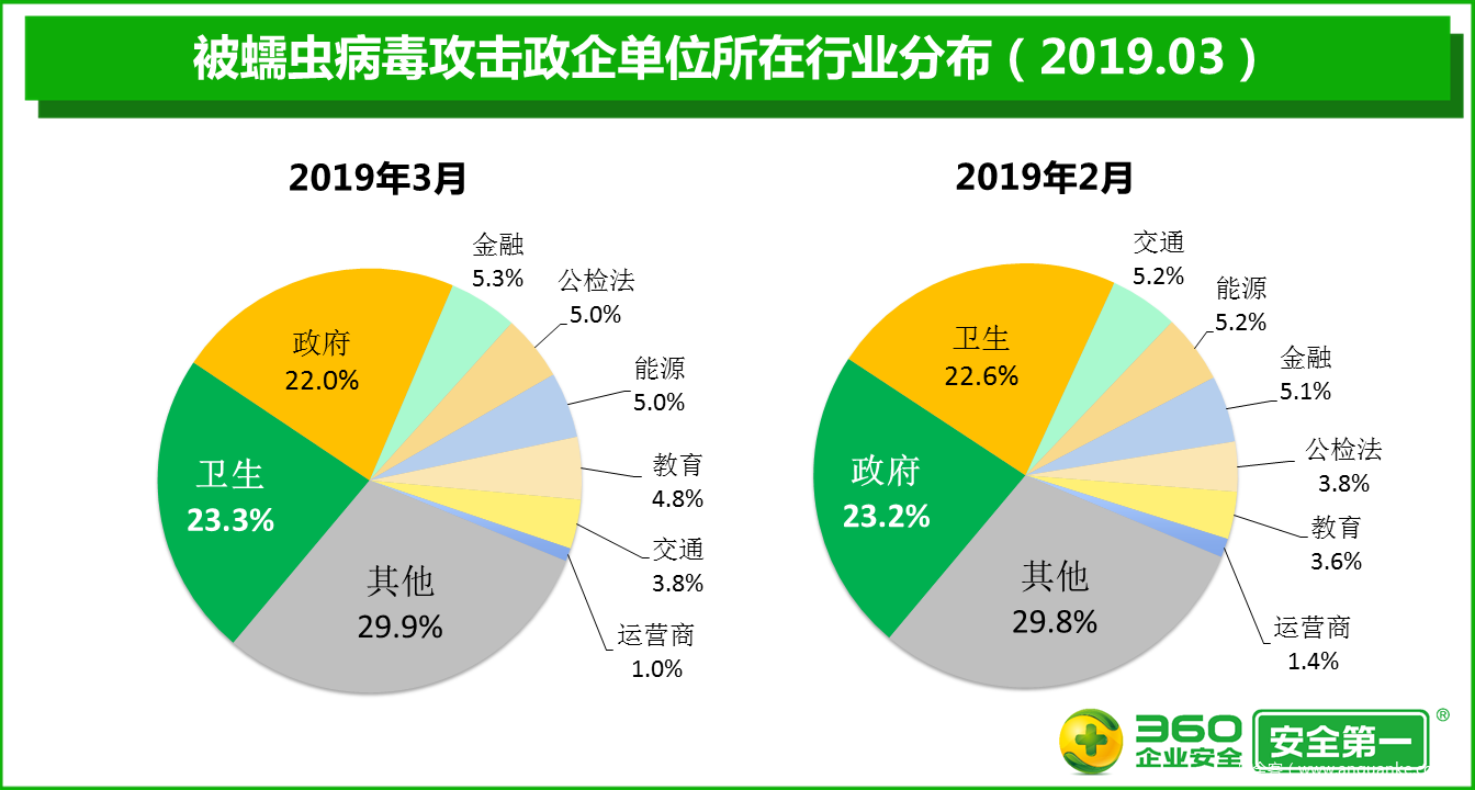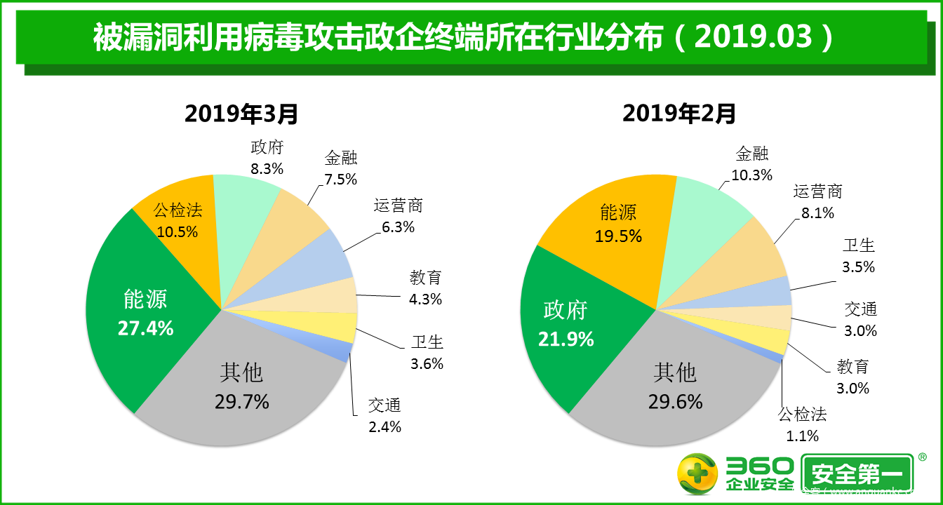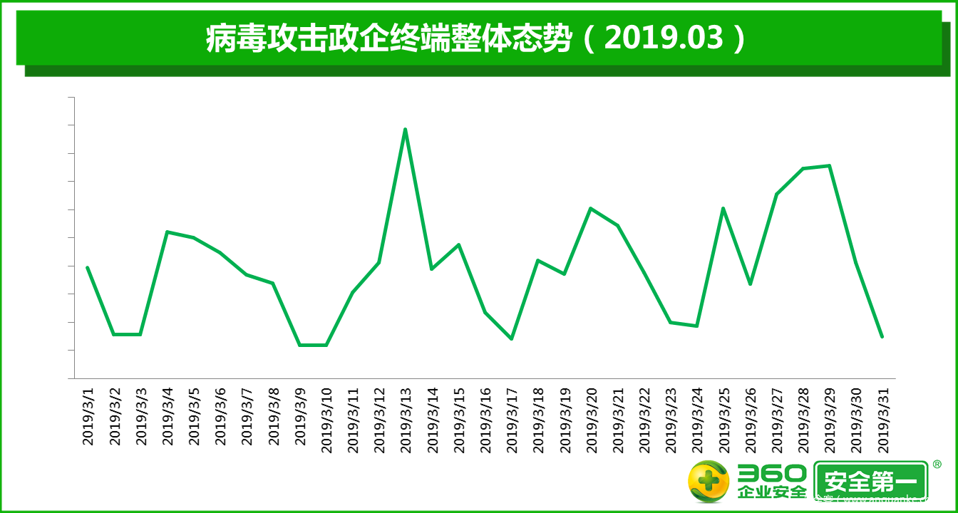 360终端安全实验室监测数据显示,2019年3月,政企单位被各类病毒攻击的事件数量比2月增加61.3%,被病毒攻击的政企终端的累计数量比2月增加44.3%,被病毒攻击的政企单位的绝对数量比2月增加44.7%。