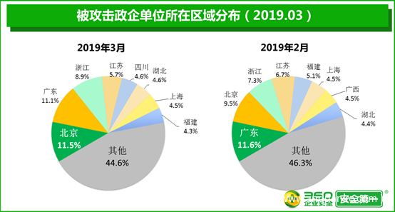 在被病毒攻击的政企单位中,北京地区最多,占比高达11.5%,被攻击单位的绝对数量比2月增加78.7%;其次是广东,占比为11.1%,被攻击单位的绝对数量比2月增加41.3%;浙江排在第三位,占比为8.9%,被攻击单位的绝对数量比2月增加79.3%。
