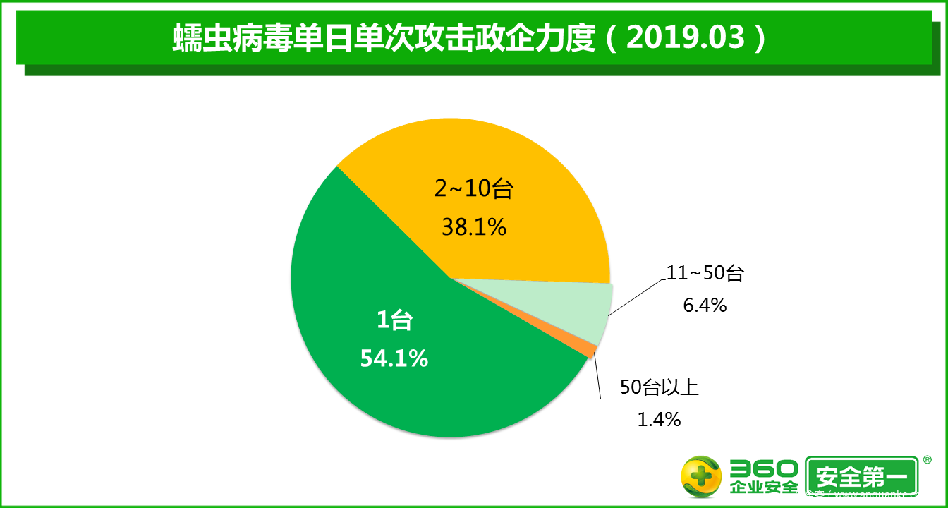 2019年3月,被蠕虫病毒攻击的事件数量比2月增加57.3%。其中,单日单次攻击政企单位的终端数仅为1台的事件比2月增加52.9%,占3月攻击事件总数的54.1%;单日单次攻击终端数为2~10台的事件比2月增加61.5%,占3月攻击事件总数的38.1%;单日单次攻击终端数为11~50台的事件比2月增加92.3%,占3月攻击事件总数的6.4%;单日单次攻击50台以上终端的事件比2月增加11.3%,占3月攻击事件总数的1.4%。