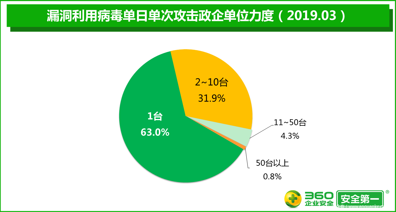 2019年3月,被漏洞利用病毒攻击的事件数量比2月增加92.9%。其中,单日单次攻击政企单位的终端数仅为1台的事件比2月增加91.4%,占3月漏洞利用病毒攻击事件总数的63.0%;单日单次攻击终端数为2~10台的事件比2月增加98.1%,占3月漏洞利用病毒攻击事件总数的31.9%;单日单次攻击终端数为11~50台的事件比2月增加78.3%,占3月漏洞利用病毒攻击事件总数的4.3%;单日单次攻击50台以上终端的事件比2月增加100.0%,占3月漏洞利用病毒攻击事件总数的0.8%。