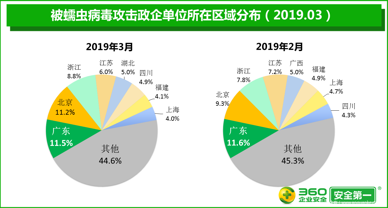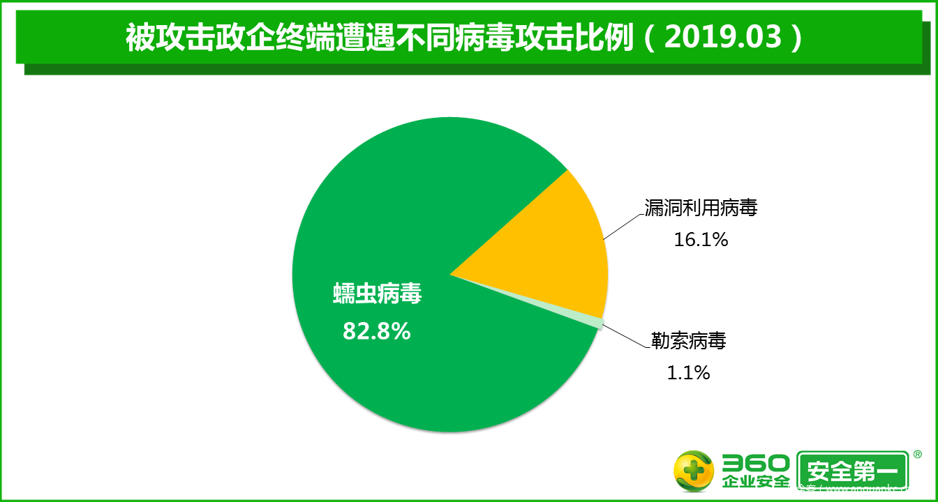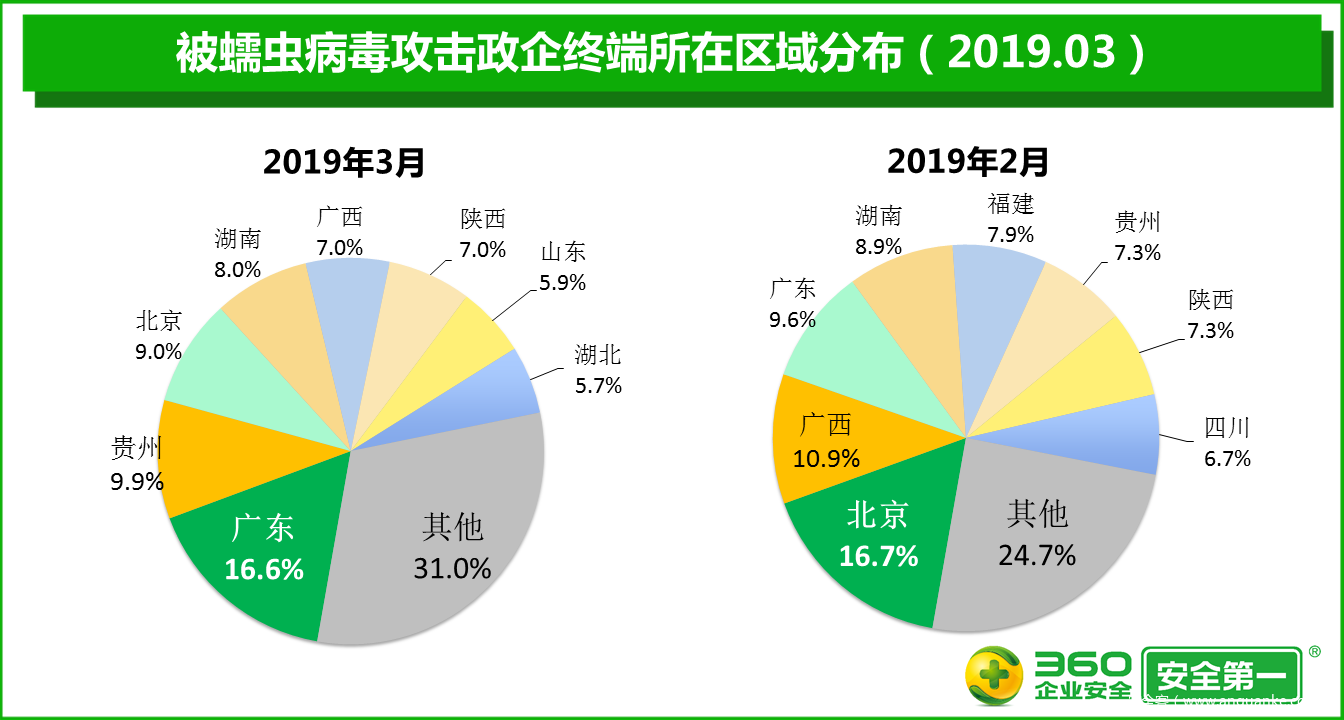 360终端安全实验室监测数据显示,2019年3月,政企单位被蠕虫病毒攻击的事件数量比2月增加57.3%,被蠕虫病毒攻击的政企终端的累计数量比2月增加34.9%,被蠕虫病毒攻击的政企单位的绝对数量比2月增加44.5%。