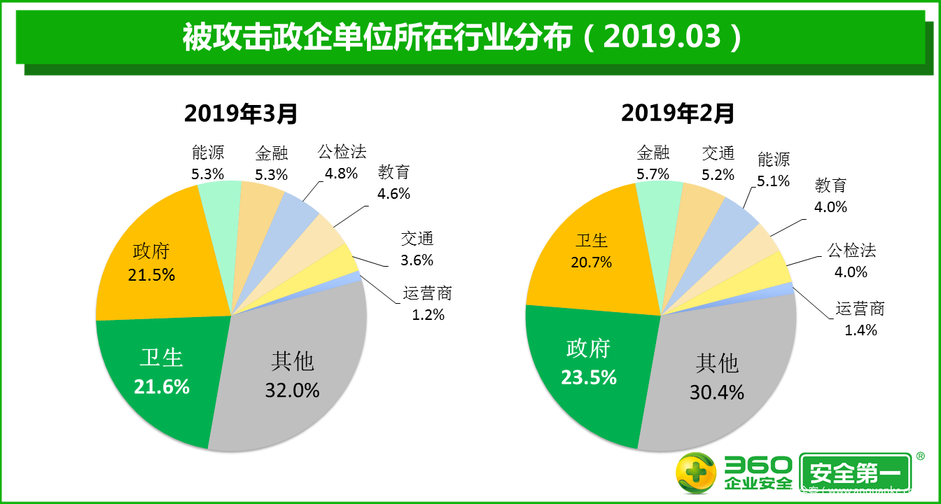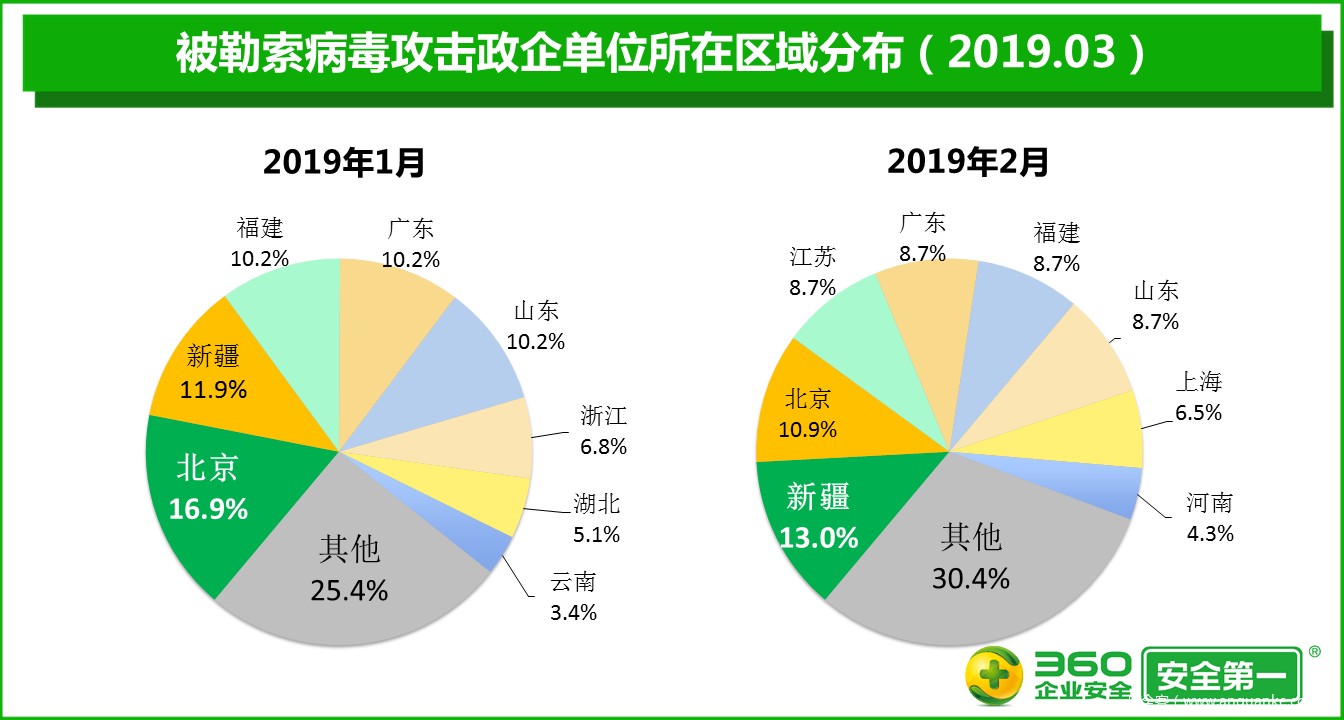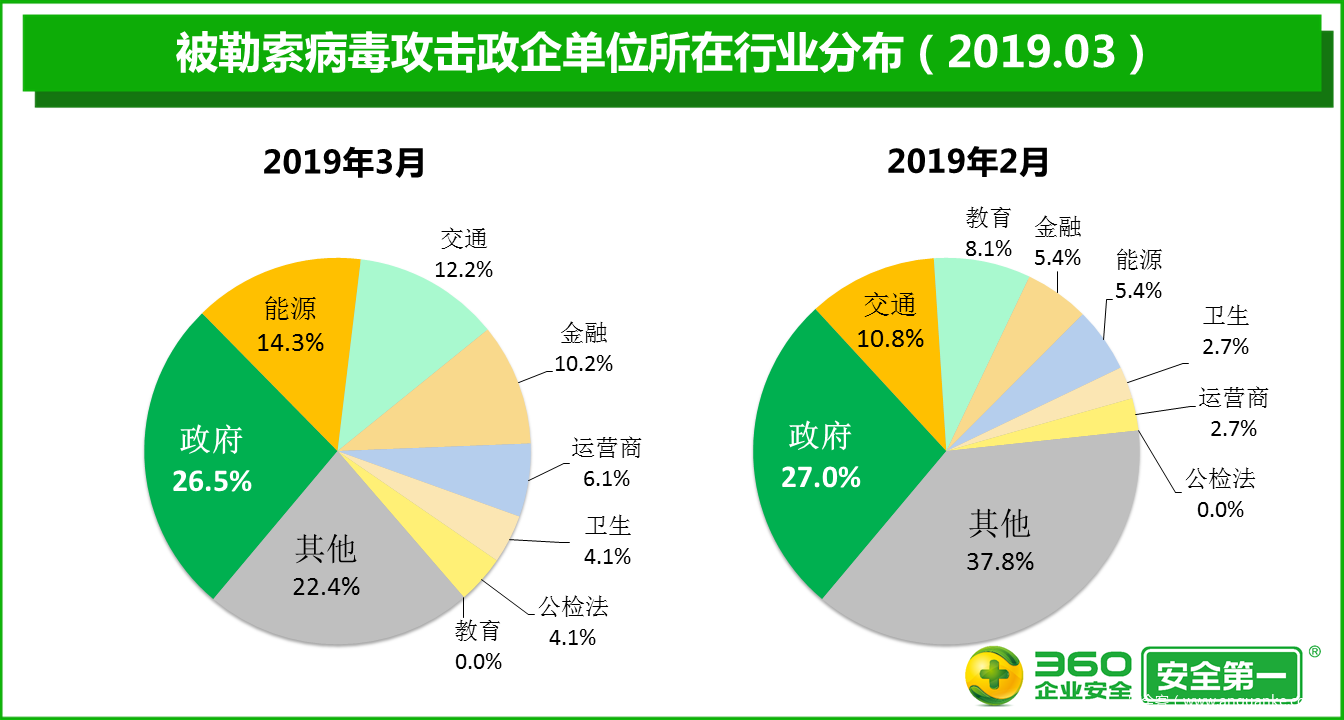 2019年3月,被勒索病毒攻击的政企单位的绝对数量比2月增加32.4%。